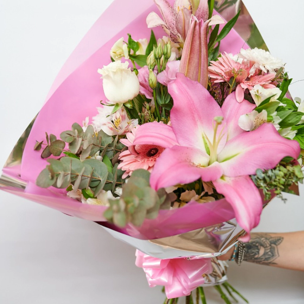 Elegi este ramo primaveral con Flores de estacion: Alstroemerias, Margaritas, Liliums, Gerberas, Rosas, Decorativo verde.